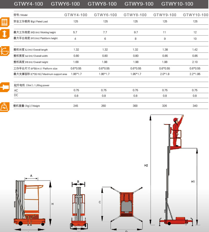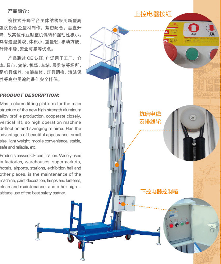 桅柱式升降平臺主體結構采用新型高強度鋁合金型材制作,緊密配合,垂直升降,故高位作業(yè)時整機偏轉和擺性極小。具有造型美觀、體積小、重量輕、移動方便、升降平穩(wěn)、安全可靠等優(yōu)點。